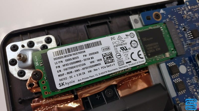 یک ماژول M.2 SSD مدل (SK Hynix HFS512GD9MND5 (2280 در ظرفیت 512 گیگابایت نیز بخش دیگر حافظه ذخیره سازی این لپ تاپ را تشکیل می دهد. این درایو از اینترفیس NVME با مسیر PCIe بهره می برد. 2280 بیشترین فرم مورد استفاده ماژول های M.2 است. درایو SSD M.2 با فاصله زیاد از هارد دیسک و درست در انتهای باترین نصب شده است.