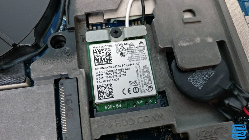این لپ تاپ دارای یک ماژول ترکیبی Wi-Fi و بلوتوث است که درست در کنار یکی از فن ها نصب شده است. دل از کارت Intel 3165NGW استفاده کرده است. و اما یکی از جالب توجه ترین نکات در این لپ تاپ، استفاده از یک پلاستیک محافظ و یکدست است که سراسر مادربرد را فرا گرفته و به نوعی از قطعات نیز محافظت کرده و آنها را از یکدیگر جدا می کند. در کنار ماژول وای فای، اسپیکر بایوس وجود دارد.