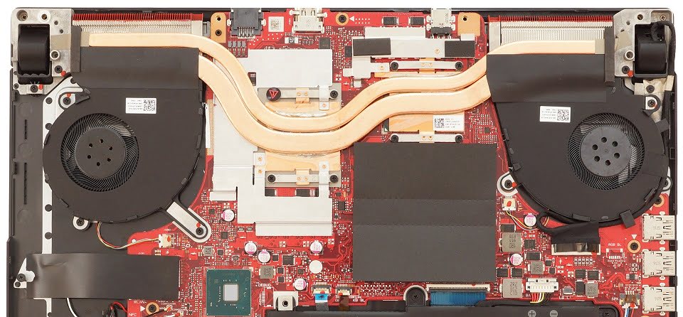 هرچند که ایسوس در تبلیغات خود برای سامانه تهویه این نوت بوک ها تبلیغات فراوانی کرده است، اما در عمل و در سخت افزار، با یک سامانه تهویه ساده روبرو هستیم. دو هیت پایپ ضخیم، از CPU و GPU عبور کرده و سپس به فن ها می رسند. فن های مورد استفاده، دارای پره های متعدد هستند که سرعت گردش هوا را بهبود می بخشند. اگزوزها به سمت عقب طراحی شده است.