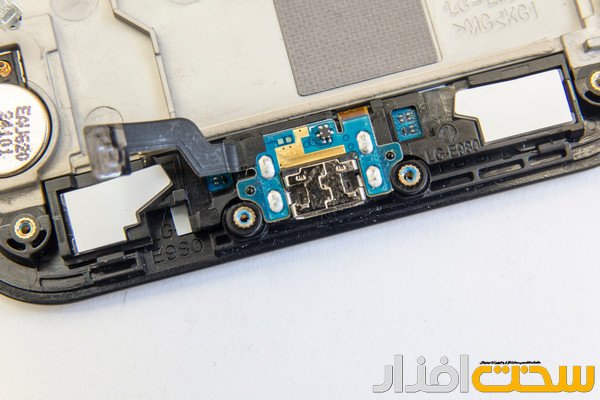 قطعه پایینی گوشی شامل پورت micro USB و دکمه های پایین صفحه نمایش. در بالای این قسمت میتوانید نوار حرارتی سیلیکونی دستگاه را مشاهده کنید که روی چیپست حافظه RAM قرار گرفته و گرمای آن را به سمت دیگر منتقل میکند.