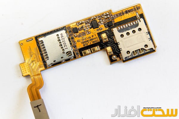 محل نصب سیمکارت و کارت حافظه microSD. در ضمن اتصالات مربوط به NFC نیز روی این بورد قرار دارند که با اتصال به درب پشت گوشی، به آنتن NFC که روی درب نصب شده متصل میشود.