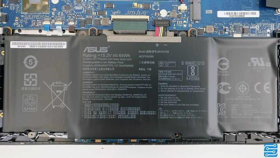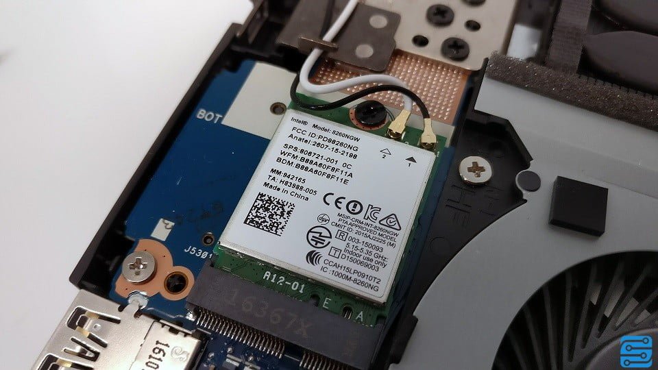 درست در کنار فن خنک کننده، ماژول ترکیبی Wi-Fi و بلوتوث قرار گرفته است. ایسوس از ماژول Intel 8260NGW در آن استفاده کرده است. دو سیم آنتن آن نیز به داخل کابینت و در اصل اطراف نمایشگر کشیده شده است.