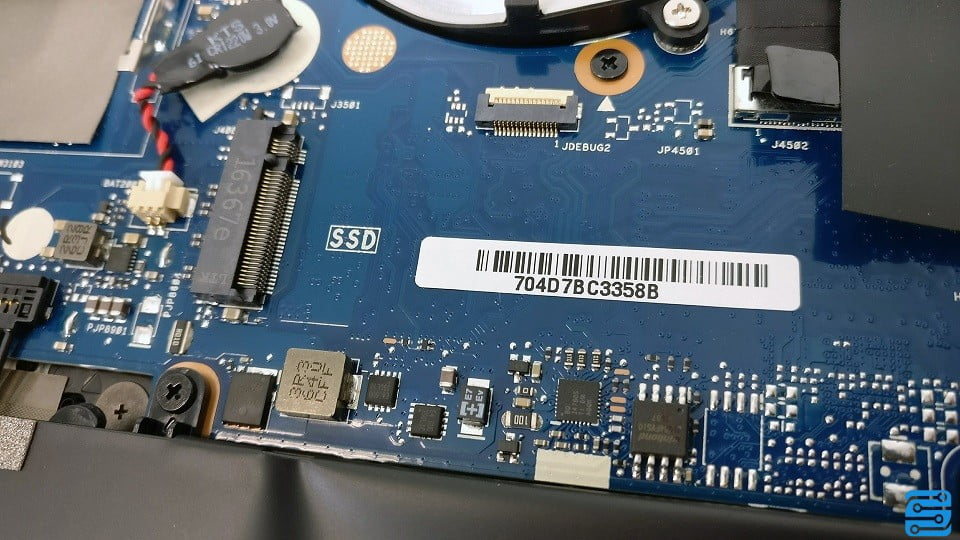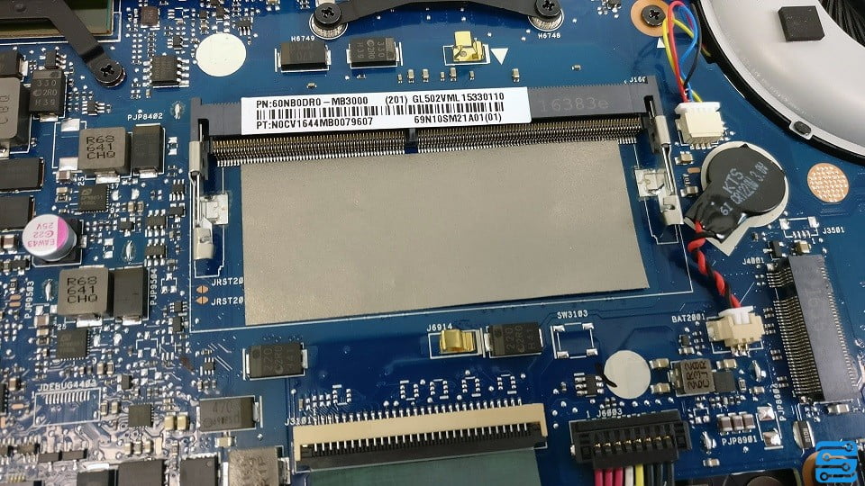 متاسفانه بزرگترین نقطه ضعف این لپ تاپ وجود تنها یک اسلات حافظه رم است؛ تمامی لپ تاپ های موجود در این حوزه قیمت، دارای دو اسلات رم هستند و از نظر تئوری این مادربرد از 24 گیگابایت حافظه DDR4 پشتیبانی می کند؛ با این وجود تنها یک اسلات برای آن در نظر گرفته شده است. عمدتا 8 گیگابایت حافظه رم DDR4 در فرکانس موثر 2133 مگاهرتز در آن نصب شده است که در نهایت می توان با صرف هزینه بالا آن را به یک ماژول 16 گیگابایتی ارتقاء داد که البته هم اینک این مقدار برای انجام بازی های روز کافی بوده و نیازی به ارتقاء ندارد. مادربدر نسبتا شلوغ است و نظم خاصی در کابل کشی دیده نمی شود. باتری عدسی نیز در کنار این بخش قرار دارد. در اطراف برد پر از کابل های مختلف و موارد مدیریت نشده است که می تواند به سادگی و با یک اشتباه به خرابی مبدل شود.