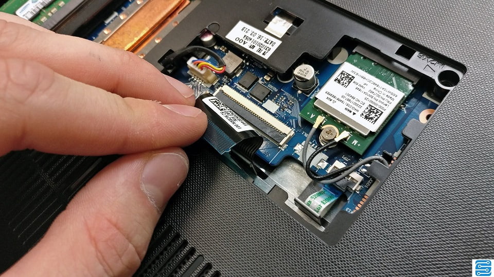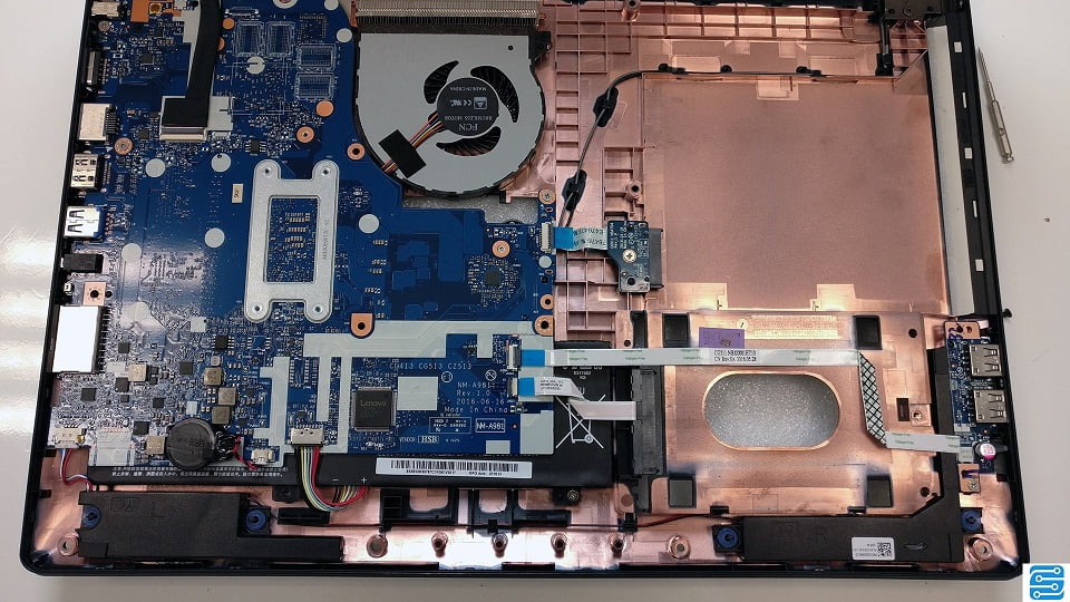 سپس به مادربرد خواهیم رسید؛ تقریبا تمامی قطعاتی باقی مانده در این قسمت قابل دسترس است به جز باتری داخلی که با توان 30 وات در ساعت فعالیت می کند. برای تعویض خنک کننده و باتری به ناچار مجبور به باز کردن پیچ های مخفی مادربرد هستید. سپس فلت کابل های مادربرد را جدا کرده و آن را بردارید.