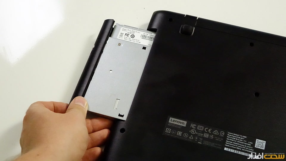 خوشبختانه بر خلاف بسیاری از مدل های لنوو، برای باز کردن درب زیرین نیازی به باز کردن کامل صفحه کلید ندارید. یک و یا چند پیچ مخفی (بسته به مدل) درایو ODD را در جای خود محکم کرده اند.