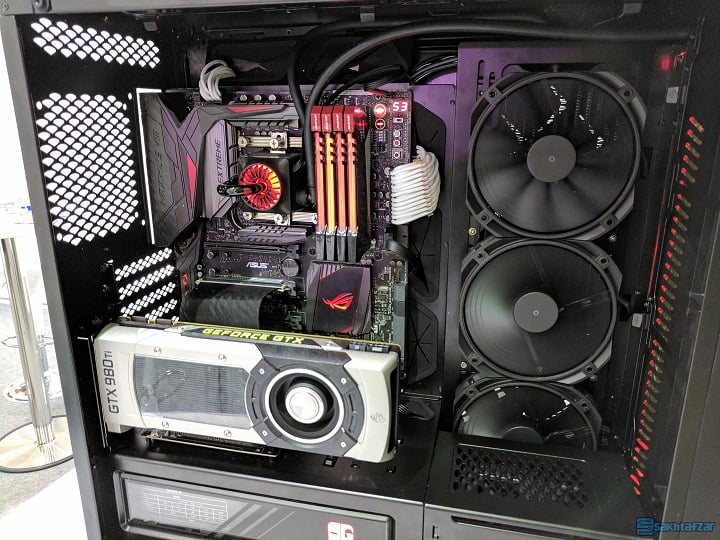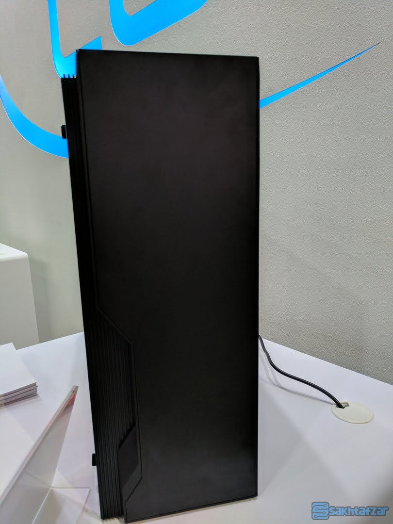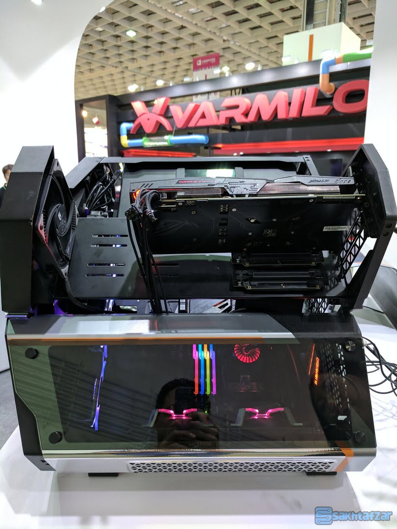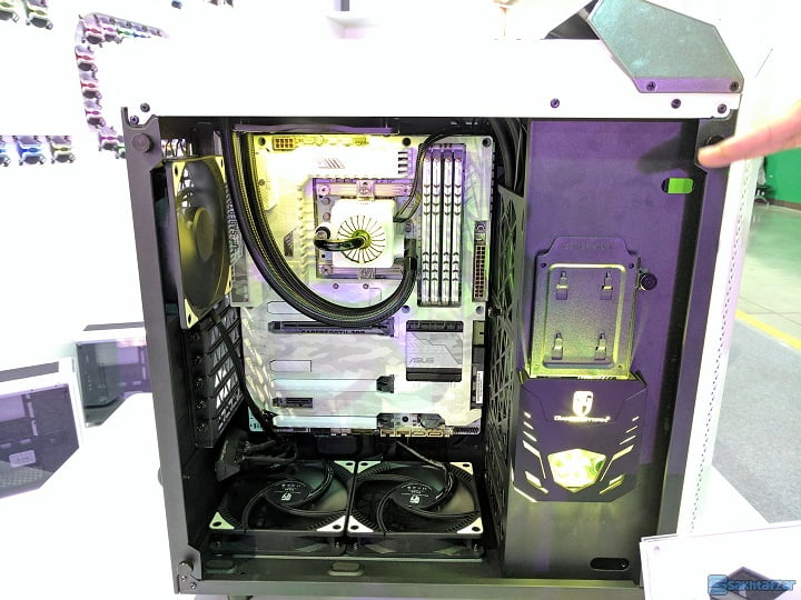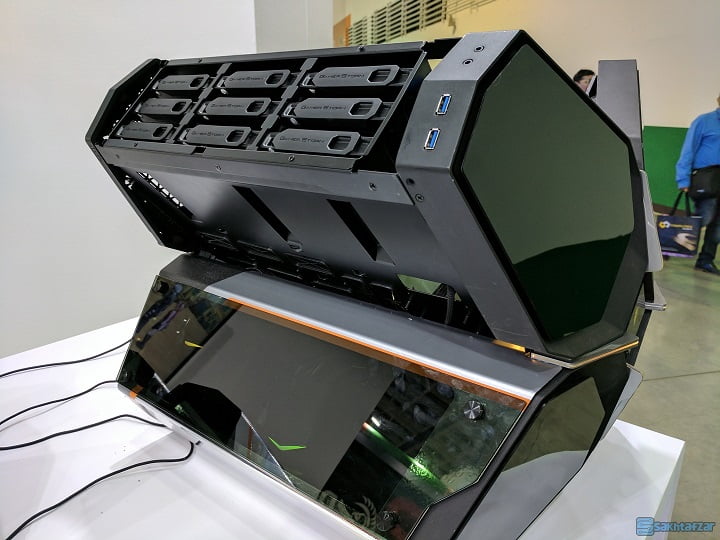 کیس جذاب و غیر معمول QUADSTELLAR در غرفه این شرکت می درخشید. این کیس دارای 4 کابینت مجزا است که برای کارت گرافیک، مادربرد، منبع تغذیه و درایو هارد دیسک به طور جداگانه تقسیم شده است. در این کیس سنسورهای دما تعبیه شده است. این سنسورها به طور هوشمند ورودی هوا را در هر بخش کنترل می کنند. به عبارت ساده تر، ورودی هوا در هر کابینت بسته به اطلاعات دریافتی از سنسور تغییر می کند. در هر بخش، قطعاتی که گرمای بیشتری را تولید می کنند تعبیه خواهند شد. از سوی دیگر نمای متفاوت و شیک QUADSTELLAR نیز مسئله ای نیست که بتوان به سادگی از آن گذشت.
