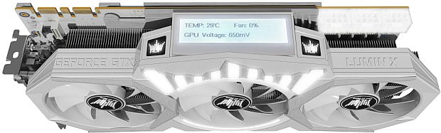 بر روی پنل I/O یک کلید فیزیکی قرار گرفته است که احتمالا مربوط به بایوس است. این کارت گرافیک دارای پتانسیل بالای اورکلاک بوده و به طور حتم در این زمینه دیگر کارت گرافیک ها را به چالش خواهد کشید. این کارت گرافیک 2 اسلات و نیم از اسلات های PCI Express قرار گرفته بر روی مادربرد را اشغال کرده و از این رو دارای جثه ای بسیار بزرگ است. همانطور که گفته شد، این کارت گرافیک در دو نسخه با قابلیت اورکلاک بالا و متوسط ارائه شده است؛ یک مدل از فرکانس 1645 مگاهرتز الی 1759 مگاهرتز بهره می برد که به بلوک Water Block مجهز شده است. نسخه دیگر نیز دارای فرکانس 1569 مگاهرتز الی 1683 مگاهرتز است. نام تجاری LUMIN X که ظاهرا نشان از یک مدار LED ثبت شده است، و در نهایت یک نمایشگر LCD با هدف نمایش وضعیت کارت گرافیک از جمله دیگر ویژگی های این محصولات است. کارت گرافیک های GALAX همواره در اورکلاک، مدار تغذیه فاز و PCB دارای کیفیت بسیار بالایی هستند.