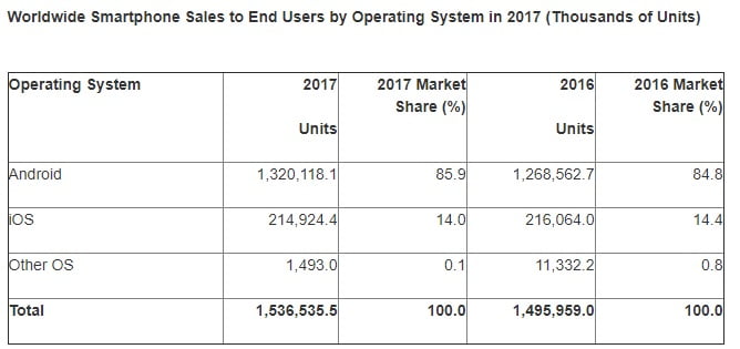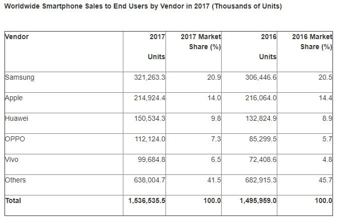با وجود افت فروشی که در سه ماه پایانی سال 2017 وجود داشت، در مجموع آمار فروش 2.7 درصد افزایش داشته و از 1 میلیارد و 495 میلیون دستگاه در سال 2016 به یک میلیارد و 536 میلیون رسیده است. 5 شرکت برتر جایگاه خودشان را حفظ کرده است، سامسونگ اول، اپل دوم و هواوی، اوپو و ویوو در جایگاه های سوم تا پنجم قرار گرفته اند. تعداد کاربران اندرویدی در سال جدید از 84.4 به 85.9 رسیده و جهش خوبی داشته است و پیشرفت را به لطف کاهش 0.4 درصدی سیستم عامل iOS و 0.7 درصدی دیگر سیستم عامل ها بدست آورده است.