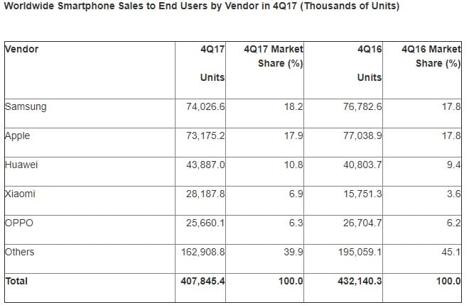 با وجود افت فروشی که در سه ماه پایانی سال 2017 وجود داشت، در مجموع آمار فروش 2.7 درصد افزایش داشته و از 1 میلیارد و 495 میلیون دستگاه در سال 2016 به یک میلیارد و 536 میلیون رسیده است. 5 شرکت برتر جایگاه خودشان را حفظ کرده است، سامسونگ اول، اپل دوم و هواوی، اوپو و ویوو در جایگاه های سوم تا پنجم قرار گرفته اند. تعداد کاربران اندرویدی در سال جدید از 84.4 به 85.9 رسیده و جهش خوبی داشته است و پیشرفت را به لطف کاهش 0.4 درصدی سیستم عامل iOS و 0.7 درصدی دیگر سیستم عامل ها بدست آورده است.