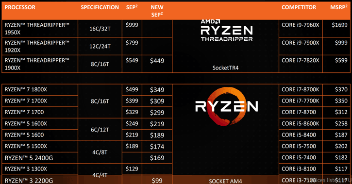 این شرکت علاوه بر جدول کاهش قیمت خود، یک جدول مقایسه مابین CPU های خود و محصولات مشابه از Intel را منتشر کرده است که این تفاوت قیمت را بیش از پیش به رخ می کشد.