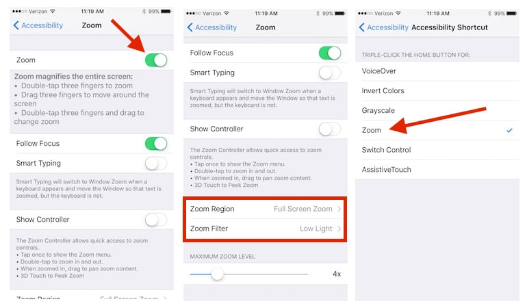 برای اینکار به مسیر Settings > General > Accessibility > Zoom رفته سپس مانند تصویر بالا گزینه Zoom را فعال کنید. در منوی تنظیمات زوم ، بخش Zoom Region را روی Full Screen Zoom قرار داده و بعد از آن گزینه Low Light را برای Zoom Filter تعیین کنید. از این پس هنگامی که زوم را فعال می کنید ، فیلتری برای صفحه نمایش فعال می شود که نور را بیش از پیش کاهش می دهد. برای استفاده راحت تر از این ویژگی دوباره به قسمت Accessibility برگردید ، در انتهای صفحه روی Accessibility Shortcut ضربه بزنید و Zoom را انتخاب کنید. از این پس با سه بار فشار دادن کلید Home بصورت متوالی ، قابلیت زوم با فیلتر تاریک کننده فعال می شود. برای بازگرداندن بزرگنمایی صفحه به حالت عادی نیز می توانید با سه انگشت خود ، دوبار به صفحه ضربه بزنید و بدین صورت از صفحه نمایش فوق تاریک بدون بزرگنمایی هم استفاده کنید.