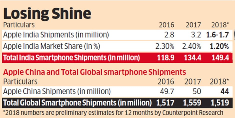 با توجه به داده‌های به دست آمده توسط موسسه تحقیقاتی کانترپوینت میزان فروش اپل در سال 2018 چیزی در حدود 1.6 تا 1.7 میلیون دستگاه بوده است، این در حالیست که سال 2017 میزان فروش دستگاه‌های آیفون در هند 3.2 میلیون بوده است. دلیل اصلی این کاهش فروش قیمت بالا و رقابت شدید آیفون‌های اپل با پرچمدارهایی با قیمت بسیار پایین‌تر مانند گوشی‌های وان‌پلاس است. در بین سال‌های 2014 تا 2017 میزان فروش گوشی‌های اپل دو برابر شده بود و از 1.5 میلیون دستگاه به 3.2 میلیون رسیده بود. این میزان افزایش ربط نسبتاً مستقیمی با افزایش میزان فروش گوشی از 80 میلیون دستگاه در سال به 150 میلیون دارد. اما متأسفانه برای اپل این وضعیت پایدار نبود و میزان فروش دستگاه‌های آن را به سال پیش بازگردانده است.