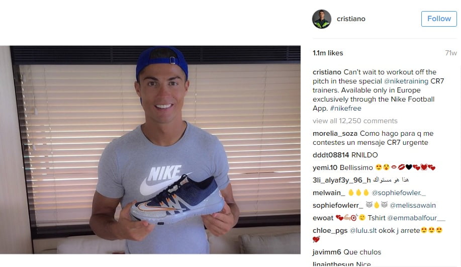 او به تنهایی از قرارداد با نایک سالانه 13 میلیون دلار بدست میاورد. رونالدو از سال 2003 بخشی از تیم نایک بوده است. گزارش شده است که قرارداد جدید او با نایک سالانه 24 میلیون دلار در سال برای بقیه عمرش کسب درآمد میکند. با این نرخ زمانی که رونالدو به سن 73 سالگی برسد، ارزش کل دارائیش به یک میلیارد دلار خواهد رسید.