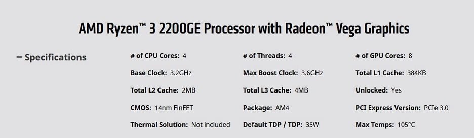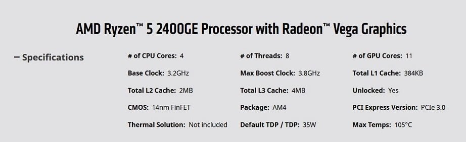 مدل های 2200 و 2400 کنونی دارای توان حرارتی 65 وات هستند و این در حالی است که AMD توان حرارتی Ryzen 3 2200GE و Ryzen 5 2400GE را تنها 35 وات عنوان کرده است. هر دو محصول در بخش CPU به 4 هسته مجهز شده و 2400GE دارای 8 رشته منطقی است. حافظه کش L2 تا 2 مگابایت و L3 تا 4 مگابایت ظرفیت خواهند داشت و آنها برای سوکت AM4 بهینه شده اند. فرکانس های بخش CPU برای Ryzen 5 2400GE برابر با 3.2~3.8 گیگاهرتز بوده و Ryzen 3 2200GE با حداکثر فرکانس 3.6 گیگاهرتز طراحی شده است. در بخش پردازش های گرافیکی، ای ام دی باز هم از معماری Vega استفاده کرده است و پردازشگر Vega 11 با فرکانس های 1100 مگاهرتز در آنها ایفای نقش می کنند.