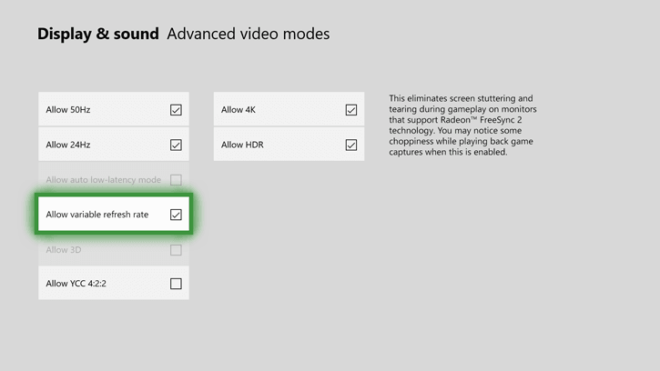 هر دو کمپانی “سونی” و “مایکروسافت” برای هر چه نزدیک تر شدن به عملکرد سیستم های PC، تلاش هایی را در پی گرفته اند که یکی از آنها بالا رفتن نرخ فرکانس بازی ها است. با این وجود کنسول بازی Xbox One ساده، با درگاه HDMI 1.4، امکان رسیدن به این فرکانس را دارا نیست. از سوی دیگر، ای ام دی به تازگی فناوری AMD Radeon FreeSync 2 را توسعه داده است و حتی کار به تلویزیون ها نیز کشیده شده و سامسونگ نیز در روزهای اخیر آپدیتی را ارائه کرده است که پشتیبانی از AMD Radeon FreeSync 2 در آن لحاظ شده است.