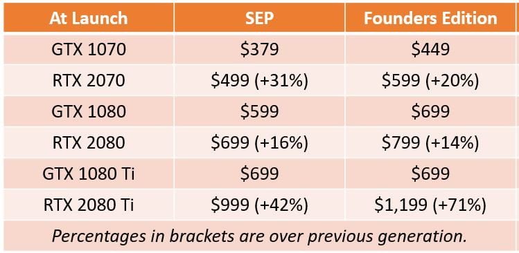 پیش از هر چیز باید به این مسئله اشاره کنیم که مدل های کنونی، در 2 مرحله با افت قیمت روبرو شده و در زمان معرفی کارت گرافیک های سری GTX1000 نیز این افزایش قیمت به نسبت مدل های “مکسول” روشن بود. با توجه به قیمت گذاری اعلام شده توسط انویدیا در کارت گرافیک های FE و SEP، در نهایت باید به این نتیجه برسیم که قیمت مدل های جدید به نسبت نسل پیشن تا 71% افزایش را نشان می دهد. این در حالی است که عملکرد آنها نیز به طور چشمگیری بیشتر از گونه های فعلی بوده و البته باید به این مسئله اشاره کنیم که با خرید مدل های مرجع (SEP) می توانید کمترین قیمت را برای این محصولات بپردازید.