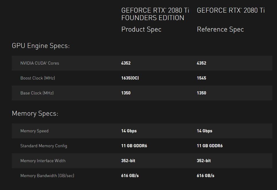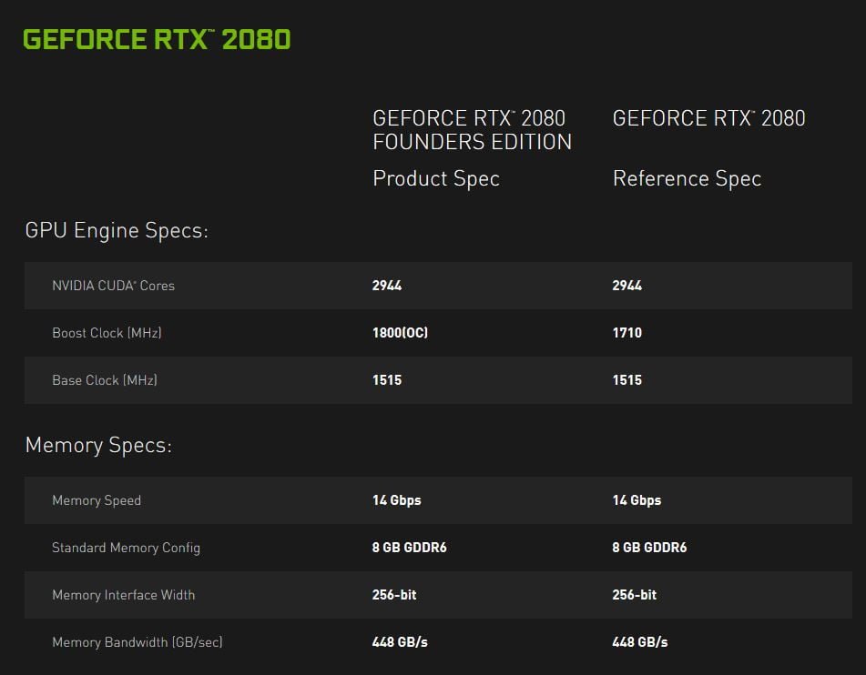 این کارت گرافیک دارای 8 گیگابایت حافظه گرافیکی GDDR6 بوده و فرکانس حافظه آن به 14 گیگابیت در ثانیه می رسد. در نسخه های سفارشی، فرکانس افزایشی تا 1800 مگاهرتز اورکلاک خواهند شد. این کارت گرافیک با رابط 256 بیتی خود، در نهایت به پهنای باند 448 گیگابایت در ثانیه می رسد. سپس به سراغ پرچمدارا ین گروه، تحت عنوان NVIDIA GeForce RTX 2080 Ti می رویم. این کارت گرافیک نیز دارای 4352 هسته CUDA بوده و فرکانس های آن در گونه مرجع برابر با 1350 مگاهرتز است که در وضعیت افزایش در مدل های مرجع و FE به 1545 مگاهرتز و 1635 مگاهرتز می رسد. این مدل دارای 11 گیگابایت حافظه GDDR6 با فرکانس 14 گیگابیت در ثانیه است که با رابط 352 بیتی، به پهنای باند 616 گیگابایت در ثانیه می رسد.