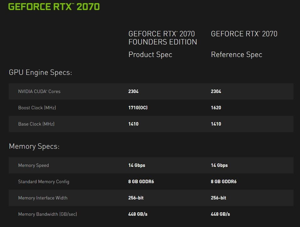 در پایان نیز کارت گرافیک RTX2070 به عنوان یک پرچمدار میانی از سوی انویدیا رونمایی شد. این کارت گرافیک دارای فرکانس پایه 1410 مگاهرتز است که به 1620 و 1710 مگاهرتز در نسخه های مرجع و FE می رسد. این مدل هم به همراه 8 گیگابایت حافظه GDDR6 و یک رابط 256 بیتی طراحی شده است. پهنای باند تراشه های تولید سامسونگ در این مدل نیز به 14 گیگابیت در ثانیه دست پیدا می کند. پهنای باند کلی این کارت گرافیک 448 گیگابایت در ثانیه است. این کارت گرافیک دارای 2304 هسته CUDA است.