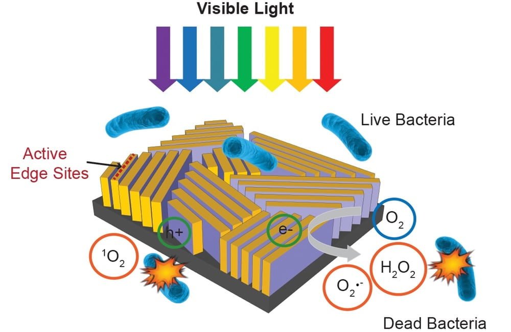 این قطعه مستطیلی کوچک به اندازه نصف یک تمبر پستی است و تنها یک تکه شیشه ای سیاه رنگ است که در ظرف تمیزی از آب قرار میگیرد. در واقع یک لایه شیشه ای که از نانو ذرات دی سولفید مولیبدن تشکیل شده است. این ذرات در گوشه ها انباشته میشوند بطوریکه گوشه های آنها به سمت بالا باشد، هر یک از این گوشه ها با یک لایه نازک از مس پوشیده شده است. وقتی نور خورشید به اندازه کافی به آن بتابد، دی سولفید مولیبدن و مس به عنوان فتوکاتالیست (کاتالیزورهایی که در حضور نور فعال میشوند) عمل میکنند و پراکسید هیدروژن و دیگر مواد شیمیایی ضدعفونی کننده را در داخل آب رها میکنند. هنگامی که کشتن باکتری ها با پایان رسید همه مواد شیمیایی پراکنده میشوند و آب خالص باقی میماند. دلیل اصلی اینکه این قطعه بسیار سریع تر از روش ماوراء بنفش عمل میکند این است که؛ اشعه UV (ماورای بنفش) تنها 4 درصد ار انرژی خورشیدی را حمل میکند در حالی نور مردی 50 درصد را.