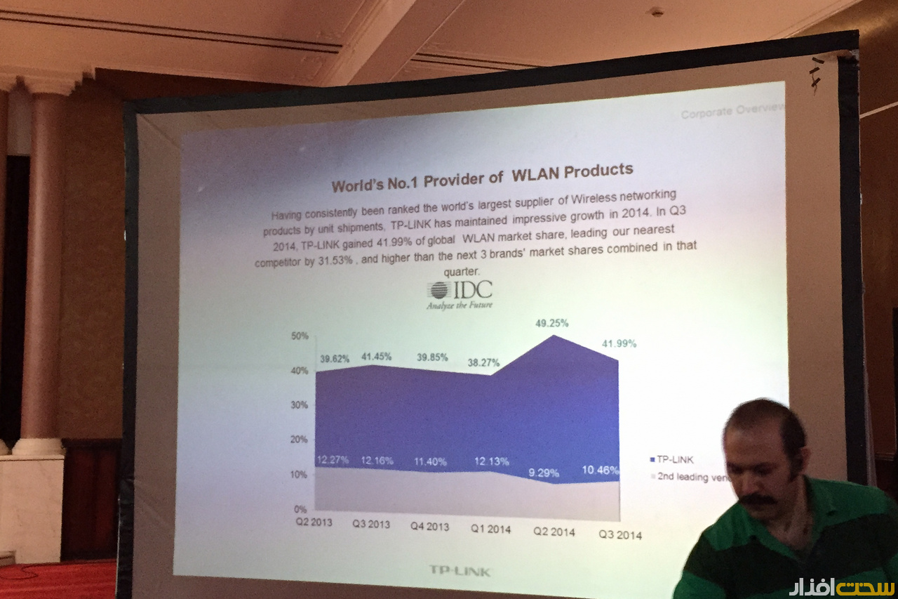 بعد از صحبت های  جناب آقای لو، نوبت به ویک کوام، مدیر فنی دفتر خاورمیانه تی پی لینک رسید. ایشان تی پی لینک را پر متنوع ترین شرکت در زمینه ارائه تجهیزات شبکه در دنیا دانستند که محصولاتی همچون گسترش دهنده های شبکه، مودم های همراه و تجهیزات بی سیم خانگی و بسیاری دیگر از محصولات اداری و عیره را تولید می کند. به گفته وی، این شرکت مطرح جهانی امسال به غیر از موارد گفته شده بر روی لوازم جانبی و تجهیزات هوشمند و سرگرمی نیز قصد سرمایه گذاری دارد. مدیر فنی تی پی لینک، دستگاه های بی سیم خانگی را یکی از مهمترین محصولات این شرکت بر شمردند که در سال جدید قرار است با ارائه نسل جدیدی از این دستگاه ها حتی با صفحه نمایش لمسی تحولی بزرگ در این زمینه به وقوع بپیوندد.