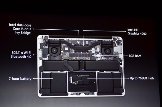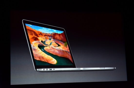 پس از ارائه آمار Phil Schiller به معرفی مدل جدیدی از مک بوک پرو با صفحه نمایش 13 اینچ پرداخت که ضخامت آن 0.75 اینچ بوده و دارای پورت USB 3.0 و خروجی تصویر HDMI است. کارت خوان SD نیز مورد دیگری است که در این مک بوک وجود دارد، اما درایو نوری از ان حذف شده است. دقت تصویر نیز 2560×1600 پیکسل است. پانل این صفحه نمایش IPS بوده و حداکثر شدت نور آن به 300nits میرسد. این دستگاه دارای بلندگوهای جدید، دو میکروفن، دوربین Facetime HD و صفحه کلید با نور پس زمینه است.