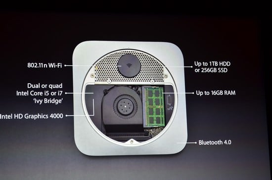دستگاه Mac mini دستگاه دیگری بود که به آن پرداخته شد. این دستگاه از پردازنده دو یا چهار هسته ای Ivy Bridge و هشت گیگابایت حافظه RAM در کنار 256 گیگابایت حافظه SSD یا یک ترابایت هارددیسک استفاده خواهد کرد. قیمت پایه این محصول 999 دلار بوده و در زمان بیکاری تنها 11 وات برق مصرف میکند.