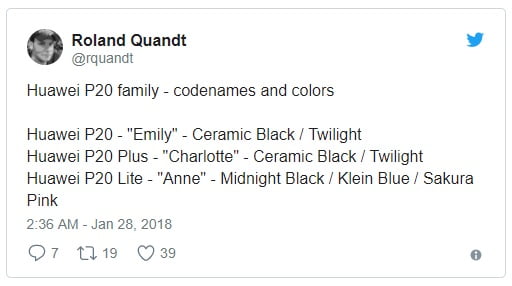 بر طبق گفتهی کوانت، خانواده P20 دارای سه گوشی می باشد. یکی از آنها پی20 لایت است، دیگر نسخه استاندارد پی20 و آخری نسخه پلاس پی20. نسخه استاندارد با کد “امیلی” دارای رنگ های مشکی سرامیکی و Twilight (که احتمالاً بنفش تیره است) است. P20 Lite با کد “آن” در رنگ های مشکی نیمه شب، آبی تیره و صورتی عرضه می شود و P20 Plus با کد “شارلوت” در دو رنگ مشکی سرامیکی و بنفش به بازار می آید. در تصویر پایین می توانید توئیت مربوط به رولند کوانت را مشاهده بفرمایید: