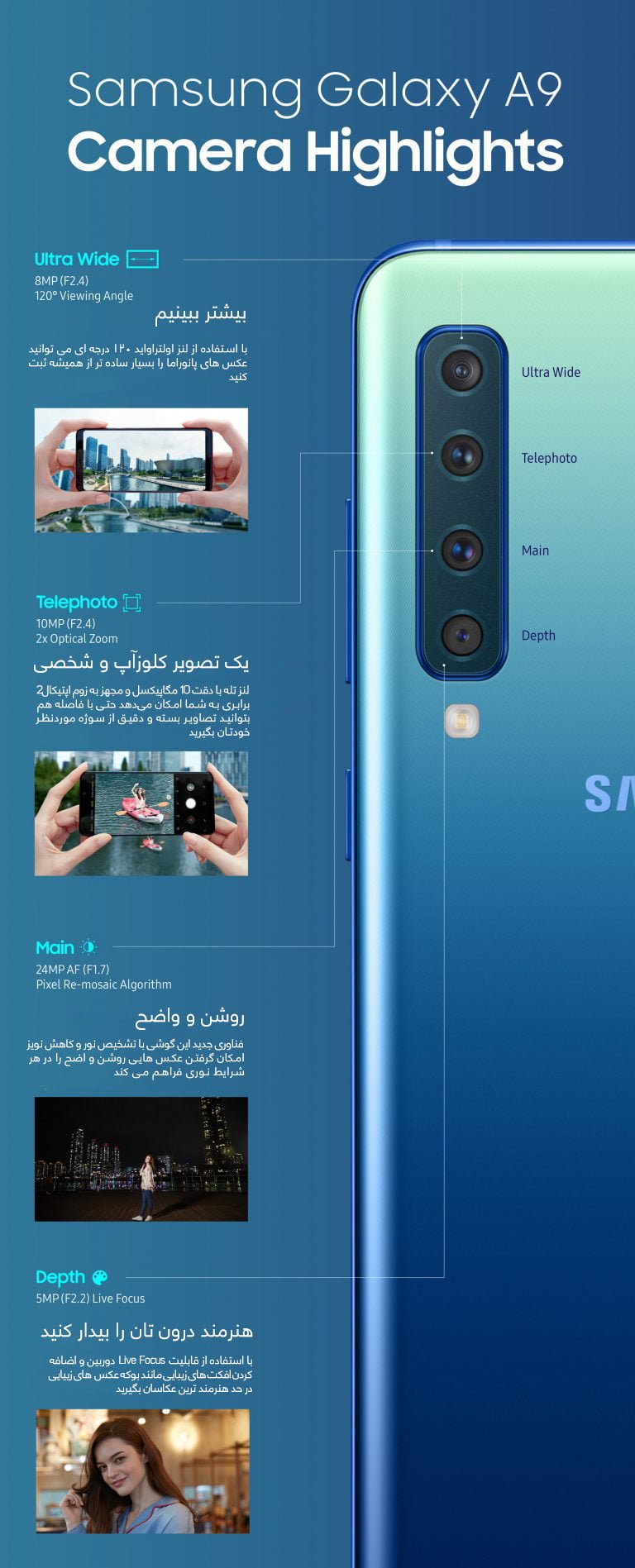 برای آشنایی دقیقتر با این قابلیتهای نوآورانه در دوربین چهارگانه گوشی گلکسی A9 اینفوگرافی زیر را برای شما آماده کردهایم: