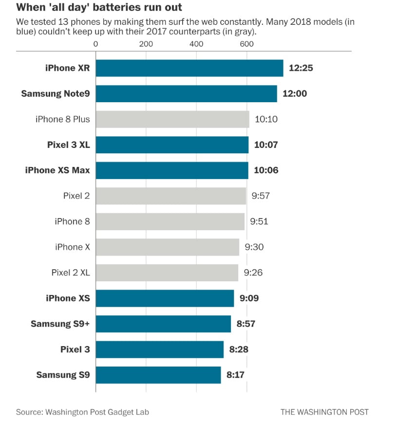 باور بسیاری براینست که گوشیهای هوشمند جدیدتر، باتری بهتری هم خواهند داشت. اما گزارش واشنگتن پست نشان میدهد که در بعضی موارد، باتری دستگاههای قدیمیتر بهتر از نسل جدیدشان عمل میکنند. به عنوان مثال پیکسل 2 و پیکسل 2 XL بهتر از پیکسل 3 گوگل عملکردهاند. هرچند که که با این وجود نتوانستند عملکرد بهتری در مقایسه با پیکسل 3 XL داشته باشند. برای دستگاههای iOS به نظر میرسد که آیفون 8 پلاس عملکرد بهتری از پرچمداران سال 2018، یعنی آیفون XS Max و آیفون XS داشته. البته آیفون XR با اختلاف قابل ملاحظهای بهترین عملکرد را در میان تمام گوشیهای اپل داشته است. گلکسی نوت 9 سامسونگ هم با اختلاف بهترین عملکرد باتری را در میان گوشیهای اندرویدی داشته است.