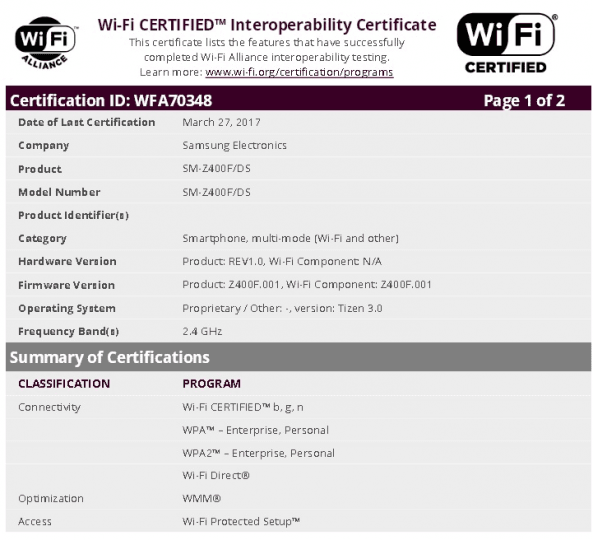 تقریبا دو هفته پیش گوشی سامسونگ Z4 در پایگاه داده از کمیسیون ارتباطات فدرال در ایالات متحده دیده شده بود ، حال امروز اخباری منتشر شده که نشان می دهد این گوشی هوشمند توانسته گواهی نامه وای فای (WFA) خود را نیز از دریافت نماید .