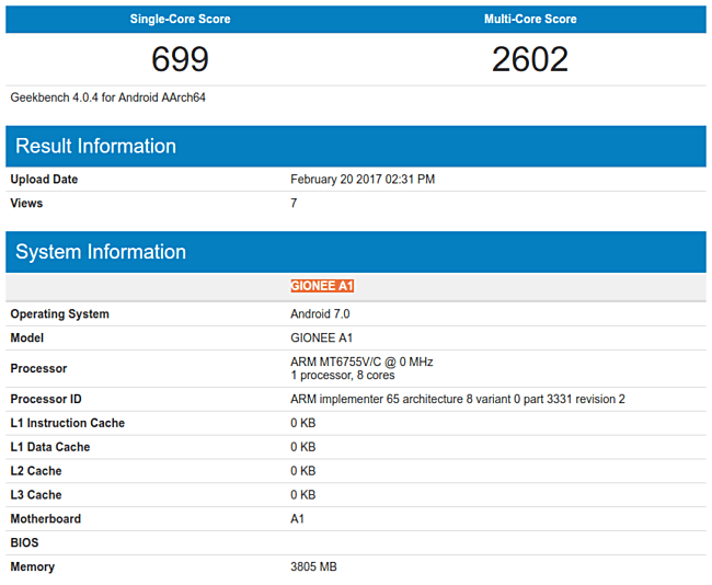 گوشی Gionee A1 در بنچمارک Geekbench رویت شد