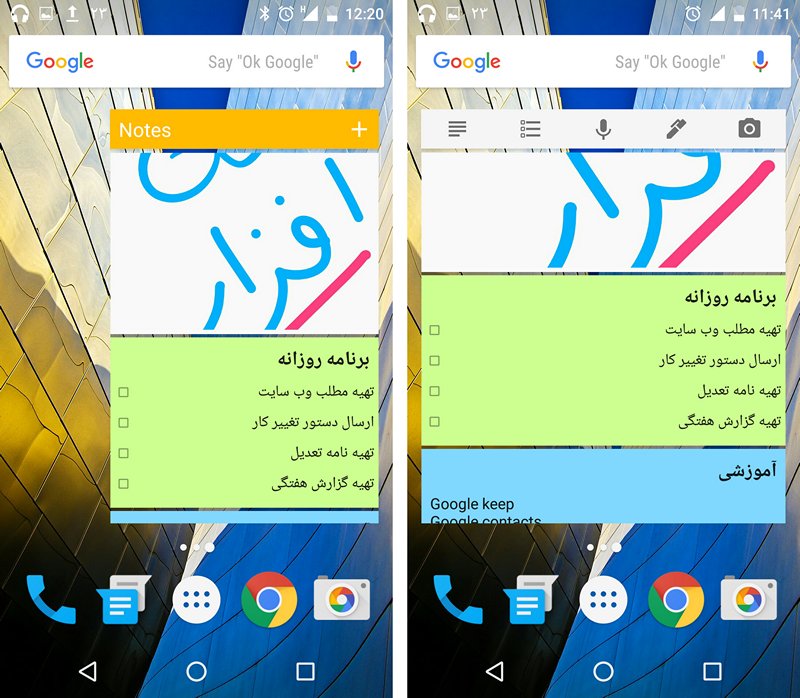 پیش از هر چیز توصیه می کنیم ویجت Keep با ابعاد 2×3 را روی یکی از صفحات خانگی قرار دهید. این ویجت که بزرگی آن قابل تغییر است، قابل اسکرول بوده و از بخش بالایی آن و با انتخاب علامت + می توانید یادداشت یا لیست تازه ای بسازید. البته اگر عرض ویجت کمی بزرگتر باشد گزینه های دیگری هم برای ایجاد یاداشت صوتی، طرح (Drawing) و عکس دیده می شوند؛ که این موارد را می توانید به یادداشت های ساخته شده هم بیافزایید.