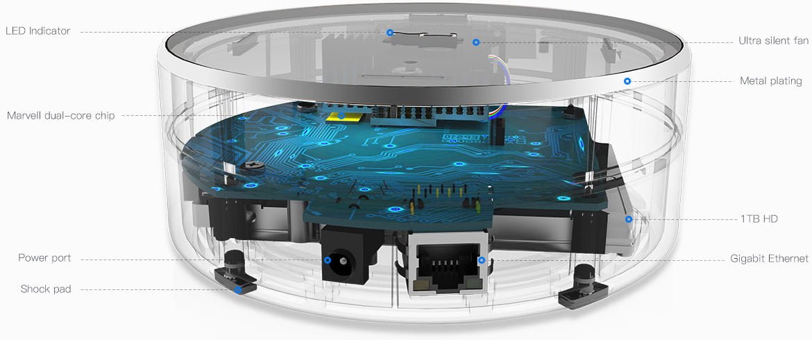 یک کنترلر دو هسته ای Marvell سرعت نقل و انتقال اطلاعات را تضمین می کند. همچنین یک خنک کننده کم صدا، یک پورت Gigabit Ethernet و امکان مدیریت کامل ادمین به وسیله نرم افزار اختصاصی موبایل، امکان پذیر است. تنها کافی است تا CatDrive را به مودم و یا روتر متصل کرده، سپس اپلیکیشن آن را از استورهای وابسته به سیستم عامل موبایل خود (مانند Google Play یا App Store ) انتخاب و نصب نمائید. سیستم ذخیره سازی CatDrive را می توان به عنوان یک سامانه برای تمامی اعضای منزل مورد استفاده قرار داده و به عنوان یک حافظه ابری-خانگی نیز انتخاب نمود. شایان ذکر است که حافظه داخلی محصول را می توان بر اساس ذخیره ساز های HDD/SSD در گونه 2.5 اینچی، تغییر داد.