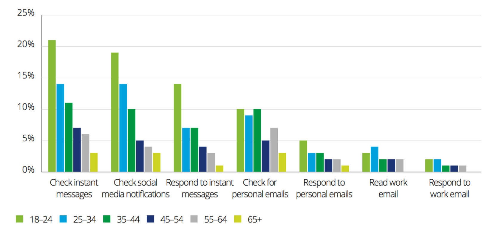 پژوهش جدیدی که شرکت مشاوره Deloittle انجام داده است، مشخص شده است که از هر سه نفر یک نفر در وسط شب موبایل خود را چک میکند. این افراد در آن زمان هرکاری از جمله خواندن پیام ها، مطالعه اخبار جدید، فرستادن ایمیل های کاری و.. انجام میدهند. در این تحقیق مشخص شده که این گروه بیشتر شامل جوان میشود. 50 درصد از این افراد با میانگین سنی 18 تا 24 سال اعتراف کرده اند که این کار را انجام میدهند این در حالیست که تنها 14 درصد افراد بالای 65 سال گوشی خود را در نیمه شب چک میکنند. در این مطالعه همچنین نشان داده شد که 52 درصد از مردم 15 دقیقه ابتدایی بعد از بیدار شدن گوشی های خود را چک میکنند و 86 درصد هم در یک ساعت ابتدایی بعد از بیدار شدن. همچنین 58 درصد از مردم تلفن های خود را 30 قبل از به خواب رفتن چک میکنند. این مطالعه در انگلستان و بروی 4000 نفر در سنین مختلف انجام شده است. نمودار زیر میزان فعالیت رده های سنی مختلف و نوع فعالیت آنها را نشان میدهد.