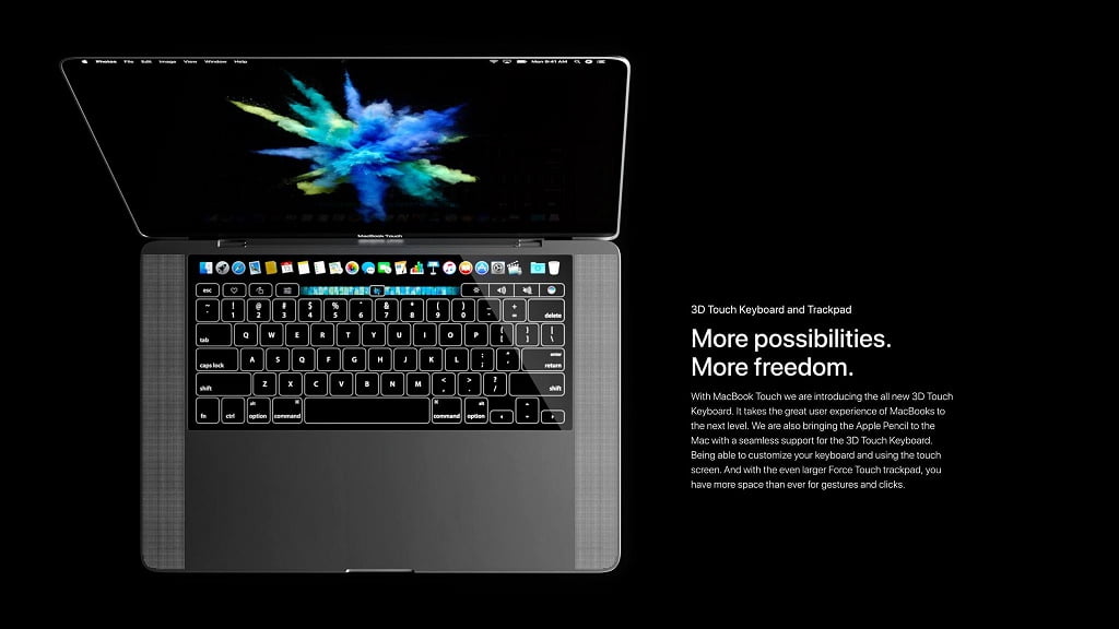 نوار لمسی اپل در این مدل بهبود یافته و به نام TouchBar 2 شناخته خواهد شد. اپل همچنان از تکنیک OLED در این زمینه بهره می برد. مک بوک پرو های موجود از نمایشگرهای 15.6 اینچی بهره می برند و در صورتی که این اخبار صحت داشته باشد، برای نخستین بار اپل این خط تولید را با مدل های 17 اینچی شارژ می کند. این امکان وجود دارد که اپل از بازخورد لمسی مانند یک موتور ویبره سبک برای القاء حس لمس کلید ها استفاده نماید؛ با این وجود همچنان احساس تایپ بر روی یک صفحه کلید فیزیکی را نخواهید داشت. در بخش دیگر، اپل نوعی قلم اختصاصی را به MacBook Touch ها اضافه خواهد کرد که برای طراحی و موارد نیمه حرفه ای نیز کاربرد خواهد داشت. آیا اپل چنین مک بوکی را تولید خواهد کرد؟ آیا شما از کار با چنین محصولی لذت خواهید برد؟