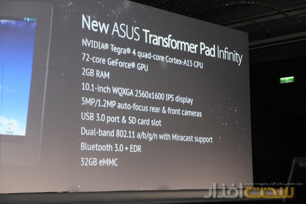 اولین محصولی که توسط مدیر عامل ایسوس در این نشست خبری معرفی شد دستگاه Transformer Pad Infinity بود. این دستگاه مجهز به پردازنده جدید موبایل Tegra 4 شرکت انویدیا است که از چهار هسته پردازشی Cortex A15 و 72 هسته پردازش گرافیکی بهره می برد. این دستگاه مجهز به صفحه 10.1 اینچی نوع IPS با دقت باورنکردنی 1600×2560 پیکسل است. برای دست یابی به کارای بهتر از دو گیگابایت حافظه RAM و 32 گیگابایت حافظه eMMC برای اجرا و ذخیره اطلاعات استفاده شده است. براساس اطلاعات ارائه شده این دستگاه قادر تصاویر 4K را از طریق پورت HDMI روی دستگاه نمایش دهد.