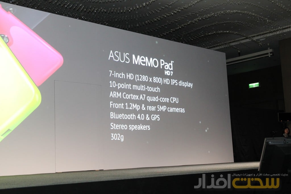 درست در پشت این صفحه مشکی رنگ این شرکت تعدادی از محصولات خود را به نمایش گذاشته بود که توجه بسیاری از افراد را به خود جلب کرده بود (البته این محصولات ان چیزی نبودند که ایسوس در برنامه نشان داد). این محصولات شامل محصول MemoPad FHD 10 که از پردازنده کم مصرف اتم Z2560 با فرکانس کاری 1.6 گیگاهرتز بهره می برد. از دیگر ویژگی های این محصول صفحه نمایش 10.1 اینچی با دقت 1200×1920 پیکسل با قابلیت لمس ده انگشتی بود که توانسته بود توجه بسیاری از افراد را به خود جلب کند.