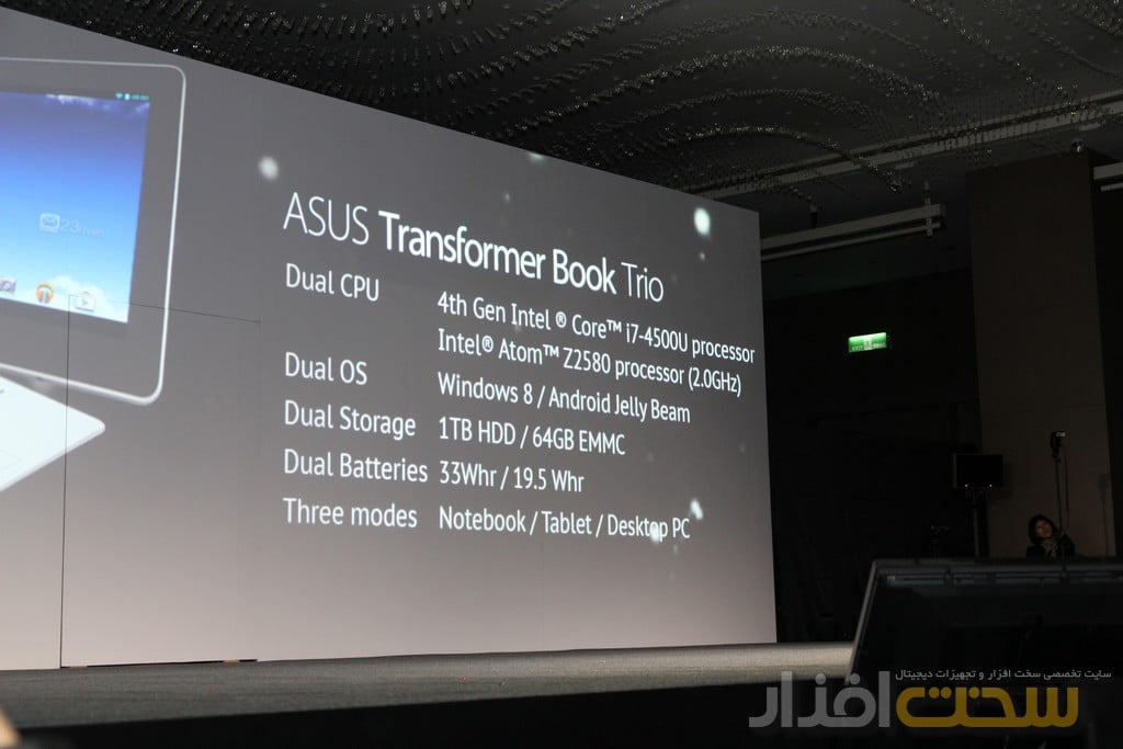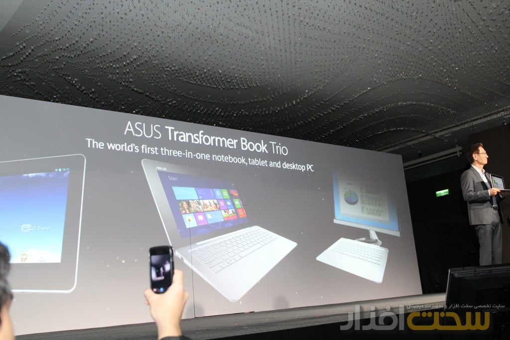 اخرین بخش این تغییرات نوت بوک بود که در این بخش shih اخرین دستاورد ایسوس یعنی نوت بوک Transformer book Trio بود که اولین نوت بوک با قابلیت استفاده در سه حالت نوت بوک، تبلت و کامیپوتر است. این دستگاه مجهز به دو سیستم عامل ویندوز هشت و اندروید است و از دو پردازنده Core i7 -4500U و پردازنده Atom Z2580 بهره می برد. در زمانی که صفحه نمایش روی داک قرار دارد پردازنده Core i7 در حال پردازش اطلاعات است اما زمانی که شما صفحه نمایش را از داک جدا می کنید پردازنده اتم فعال شده و دستگاه به صورت تبلت خواهد بود. در این حالت دستگاه به صورت پیش فرض با سیستم عامل اندروید کار خواهد کرد. اما ایسوس برای مدیریت بهتر امکان جا به جایی بین سیستم عامل را با استفاده از یک کلید که در کنار دکمه های مدیریتی بالای دستگاه تعبیه شده را فراهم کرده است. این دستگاه از دو باتری 33 وات ساعتی بهره می برد.
