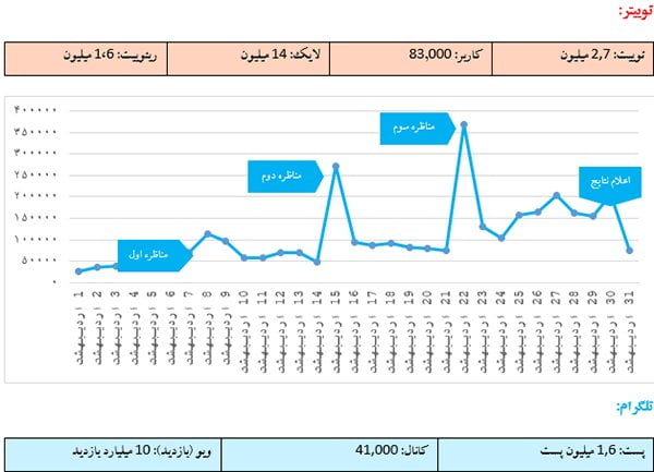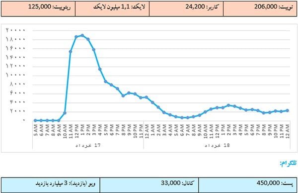 در توئیتر، 2.7 میلیون توئیت، 11 میلیون لایک و 1.6 میلیون ریتوئیت از 83 هزار کاربر ایرانی ثبت شده است.