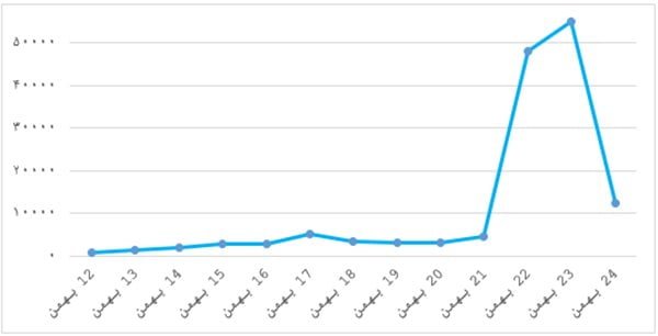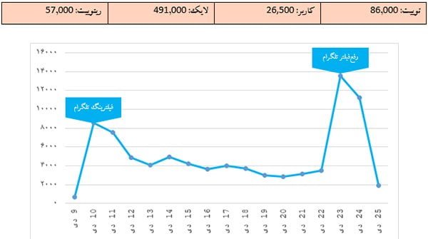 در فاصله زمانی 9 دی تا 26 دی، 26 هزار 500 کاربر توئیتری بیش از 86 هزار توئیت در خصوص فیلترینگ تلگرام منتشر کردند که 491 هزار بار لایک و 57 هزار بار ریتوئیت شدند. البته به دلیل مسدود بودن تلگرام در این فاصله زمانی آمار درستی از فعالیت مرتبط با موضوع فوق در این شبکه اجتماعی وجود ندارد.