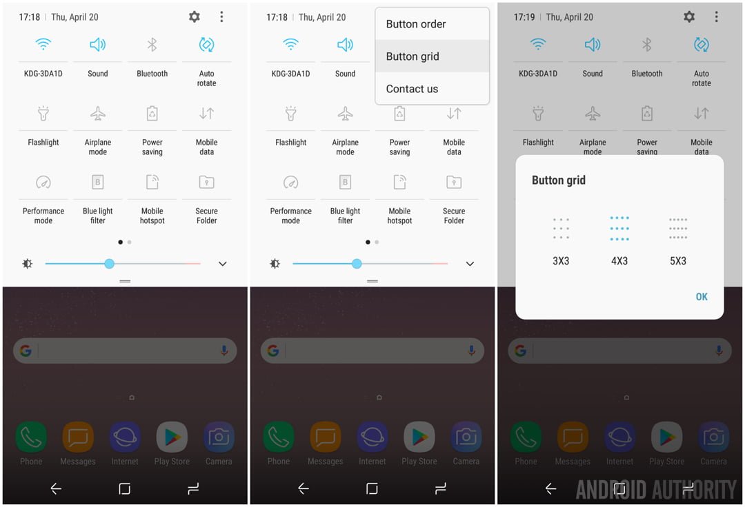 منوی تنظیمات سریع یکی از بخش های بسیار پر کاربرد گلکسی های سامسونگ است که در نسخه ی جدید تاچ ویز طراحی زیباتر و گزینه های جدیدی را دریافت کرده است. در این بخش به گزینه های پر کاربردی مثل وای فای، لوکیشن، بلوتوث، موبایل دیتا و غیره دسترسی خواهید داشت. این بخش را نیز میتوانید شخصی سازی کنید و گزینه هایی را حذف یا اضافه کنید یا میتوانید ابعاد منو را تغییر دهید. برای این کار منوی تنظیمات سریع را باز کنید و بر روی سه نقطه ی گوشه ی راست بالای نمایشگر لمس کنید و گزینه ی Button Layout را بزنید. سه حالت به شما نمایش داده میشود که پیشنهاد میشود حالت 3*5 را انتخاب کنید تا گزینه های بیشتری را در یک صفحه در اختیار داشته باشید تا نیازی به سوایپ کردن به صفحه ی دوم نباشد.