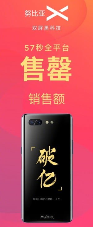 نوبیا X در سه رنگ و با سه پیکربندی در چین عرضه خواهد شد و جالب است بدانید که فروش 100 هزار واحد از این گوشی امروز در کمتر از یک دقیقه به پایان رسید. با انتشار پستی در شبکه اجتماعی چینی Weibo، نوبیا با افتخار اعلام کرد که اولین فروش این دستگاه که 100 هزار واحد بود، تنها در 57 ثانیه به پایان رسید. البته آنها برای موج دوم فروش این گوشی برنامهریزی کردهاند و قرار است که در نیمهشب 11 نوامبر (20 آبان) در روز جهانی جشنواره خرید در چین، دوباره نوبیا X را برای فروش در سایت قرار دهند.
