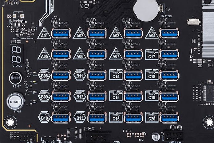 در صورت استفاده از تک اسلات PCI-Express gen 3.0، رابط اول USB خاموش می گردد. در نتیجه باز هم حداکثر 20 کارت گرافیک در این مادربرد مخصوص ماینینگ قابل نصب است. ایسوس از 20 درگاه USB 3.1 در این مادربرد بهره گرفته است که مزایای بسیاری به همراه دارد؛ نخست آنکه با خرید یک مادربرد، ماینرها می توانند از 20 کارت گرافیک به طور همزمان استفاده نمایند. دوم آنکه کاربران در هنگام اتصال به رابط های PCIe-over-USB، نیازی به رابط رایزر USB نخواهید داشت و کارت گرافیک مستقیما به مادربرد تنها با یک رابط متصل می گردد.