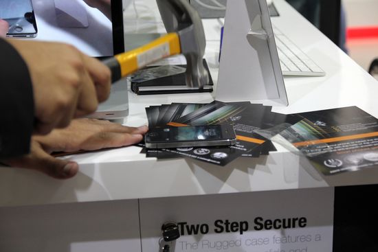 روکش نانوی iPhone نیز مورد جالب دیگر این غرفه بود. این روکش ضخامتی کمتر از یک میلیمتر داشته و با استفاده از فناوری نانو ساخته شده است. این روکش بر پشت، و اطراف گوشی چسبانده شده و آن را در برابر شدید ترین ضربه ها مقاوم میکند. برای نمایش کارایی آن نیز یک گوشی iPhone 4S چندین بار بر زیر ضربات محکم چکش قرار گرفت و سپس به زمین کوبیده شد! پس از تمامی این بلایا گوشی همچنان به خوبی کار میکرد (حالا تصور کنید که هر روز چندین بار این قابلیت به بازدید کنندگان نمایش داده میشود!).