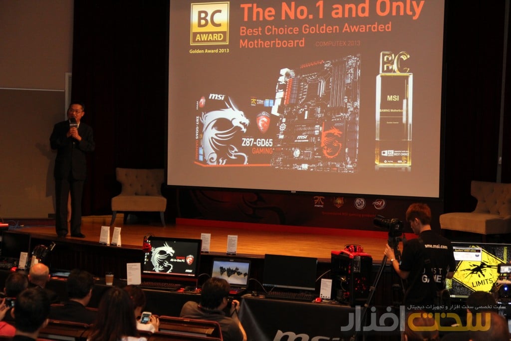 در ابتدای جلسه اعلام شد محصولات msi از این به بعد در سه دسته Overclocking با رنگ زرد، محصولات Gaming با رنگ مشکی و نشان اژدها و در نهایت محصولات Classic با رنگ آبی (بیشتر برای استفاده در امور روزمره و اداری و پردازش های متوسط) قرار خواهند گرفت تا کاربران بتوانند به شکلی بهتر و بهینه تر و به سرعت محصول مورد نظر خود را بیابند. پس از آن به دریافت نشان BC Award توسط مادربورد جدید Z87-GD65 Gaming اشاره شد که پیش از این خبر آن را در سایت سخت افزار منتشر کرده بودیم.