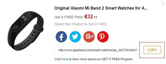 با مراجعه به صفحه http://www.gearbest.com/get-it-free/ در گیربست می توانید فهرستی از کالاهایی که در بخش خرید رایگان قرار دارند را مشاهده کنید. اگر تصمیم به خرید یکی از این کالاها را دارید کافی است لینک مربوط به آنها را در شبکه های اجتماعی به اشتراک گذاشته و یا آن را برای دوستانتان بفرستید. با انجام هر خرید که از طریق لینک به اشتراک گذاشته شده توسط شما انجام شود امتیازی به حساب کاربری شما واریز می شود و پس از رسیدن امتیازات به حد نصاب می توانید کالای خود را به صورت رایگان خریداری کنید. اجناس تا 3 دلار نیاز به یک خرید، اجناس 3 تا 10 دلاری نیازی به 2 خرید، 10 تا 20 دلاری 3 خرید و 20 تا 50 دلاری نیاز به انجام 5 خرید از طریق لینک های به اشتراک گذاشته توسط شما دارند.