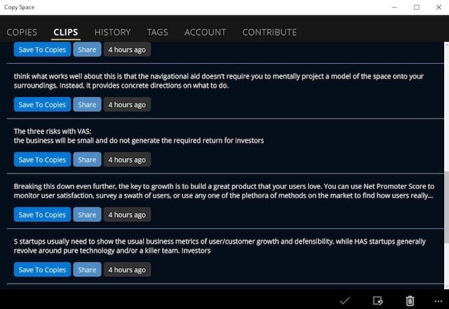 این برنامه کمی با برنامه های دیگر فرق دارد و قابلیت های متفاوتی ارائه کرده است. همچنین پس از خاموش شدن سیستم همچنان موارد کپی شده را در خود نگه میدارد. شما میتوانید عناصر کپی شده ی خود را به کمک این برنامه به گوگل درایو نیز منتقل کنید. Copy Space، تنها موردی است که در Windows Store میتوانید آن را در اختیار داشته باشید و در ویندوز 10 از آن بهره مند شوید.