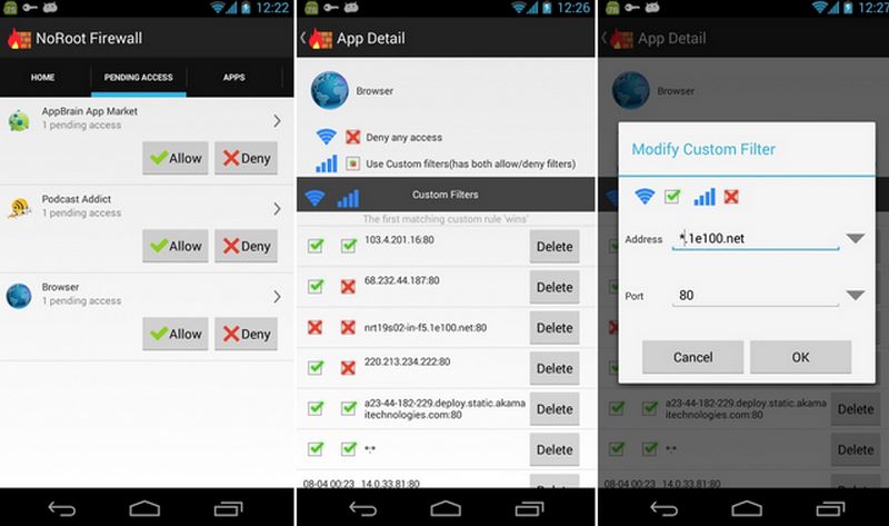 این برنامه کمی با دیگر برنامه های امنیتی که در این لیست معرفی میکنیم متفاوت است و در نگاه اول به جذابی دیگر برنامه ها نیست اما ویژگی های منحصر به فرد این برنامه موجب کاربردی شدن آن شده است. بر خلاف دیگر برنامه های امنیتی دیوارهی آتش که نیاز به دسترسی روت دارند و همان طور که میدانید روت کردن گوشی اندرویدی به معنای باطل شدن گارانتی آن است، No Root Firewall نیازی به روت شدن گوشی شما ندارد و در عین حال تمامی خدمات دیگر فایر وال ها در اختیار کاربر میگذارد. فیلترینگ بر اساس نام و دامنه، ترکیب بندی خوب دسترسی ها، و عدم نیاز به دسترسی های مشکوک مانند دسترسی به مخاطبین و موقعیت و رابط کاربری ساده و دلنشین از مزایای No Root Firewall به شمار میرود.