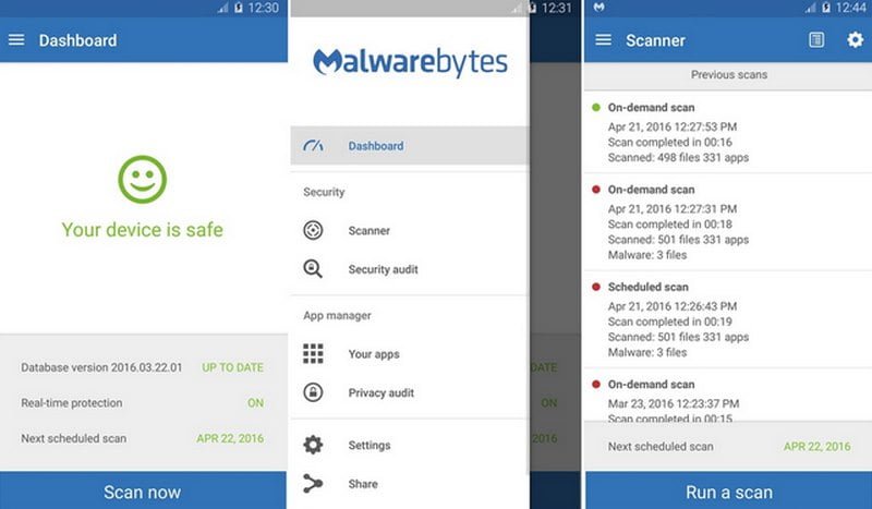 نسخه ی ویندوزی این برنامه از مشهورترین برنامه های ضد بد افزار به شمار میرود که بسیار قدرتمند عمل میکند. این برنامه نسخه ی اندرویدی نیز دارد و از گوشی شما در برابر تروجان ها و کد های مخرب ، برنامه های ناخواسته، وب سایت های آلوده، پیام های ناخواسته، ردیابی موقعیت شما توسط برنامه ها بدون اجازه ی شما و دیگر آسیب های امنیتی محافظت میکند. Anti-Malware کارهایی که توسط برنامه های مختلف در گوشی شما در حال انجام است را تشخیص میدهد و اطلاعات شخصی شما را زیر نظر قرار میدهد. همچنین این برنامه با پیشنهاد های مختلف شما را برای بستن حفره های امنیتی مختلف یاری میکند. Anti-Malware توانایی محافظت به صورت ریل تایم و هوشمند را دارد. اسکن دقیق حافظه ی داخلی و کارت حافظه، حذف برنامه های آسیب دیده، مدیریت دسترسی به صورت طبقه بندی شده و بسیار ویژگی دیگر از مشخصه های این برنامه ی کاربردی و مفید به شمار میرود.