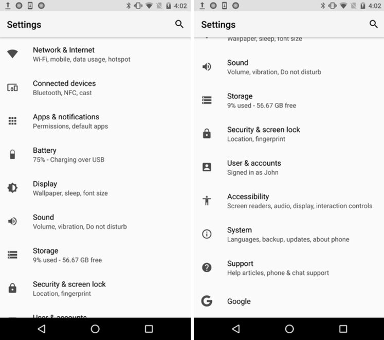 منوی تنظیمات اندروید پیچیدگی های چندانی ندارد اما گوگل قصد دارد محیط ساده تری را برای کاربران فراهم کند. در حال حاضر در اندروید 7 نوگا شاهد استفاده از 24 گزینه در منوی تنظیمات (در اندروید خالص) هستیم و گوگل در اندروید Oreo این تعداد را به 12 مورد کاهش خواهد داد. چنین کاری باعث می شود جست و جو برای یافتن یک گزینه با سهولت بیشتری انجام شود و تنظیمات مختلف از پراکندگی نجات پیدا کنند.